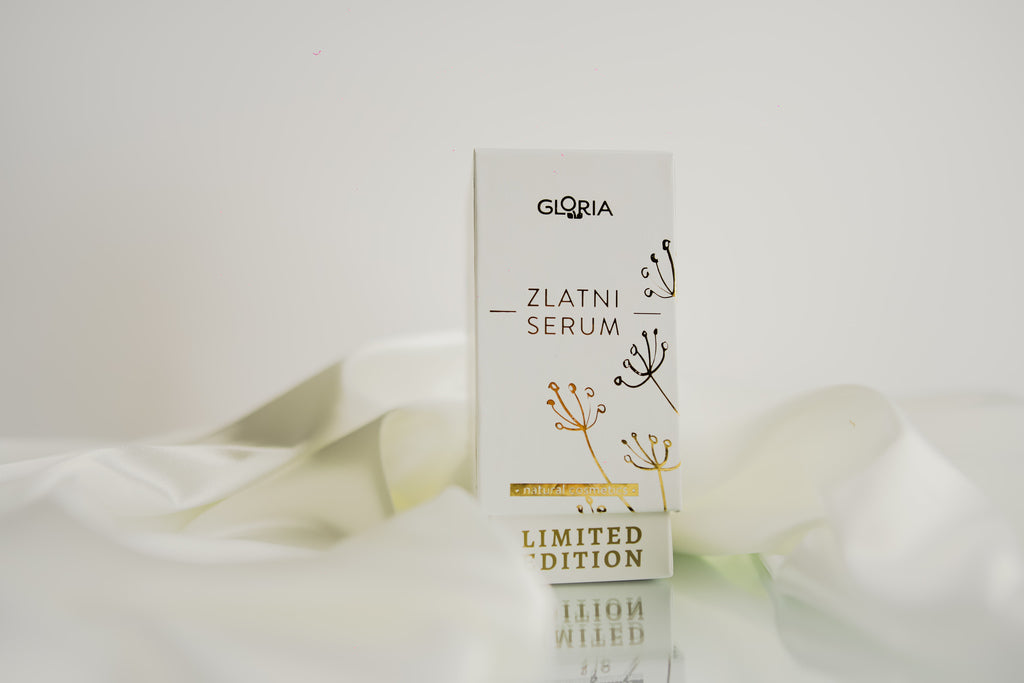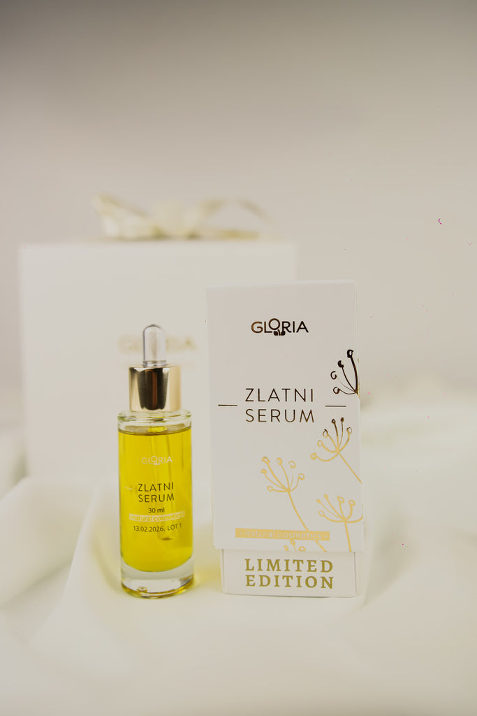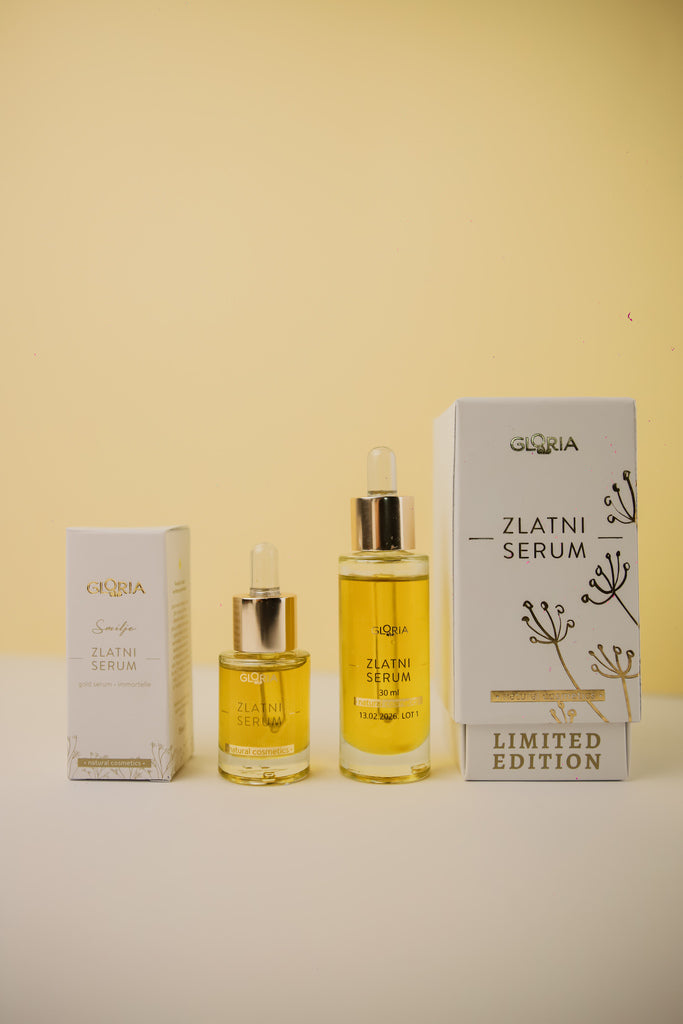 Zlatni serum dolazi u pakovanju od 15 ml, ali je tim Gloria Prirodne kozmetike povodom odlučio da se zahvali svim damama na dugogodišnjoj vernosti i negovanju prirodne lepote sa ograničenim izdanjem Zlatnog seruma u pakovanju od 30 ml.